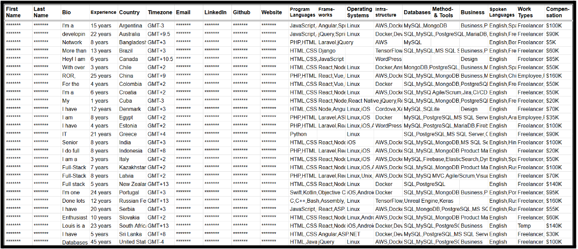 20+ data points/details per profile, including skills, location, availability, compensation, and contact links